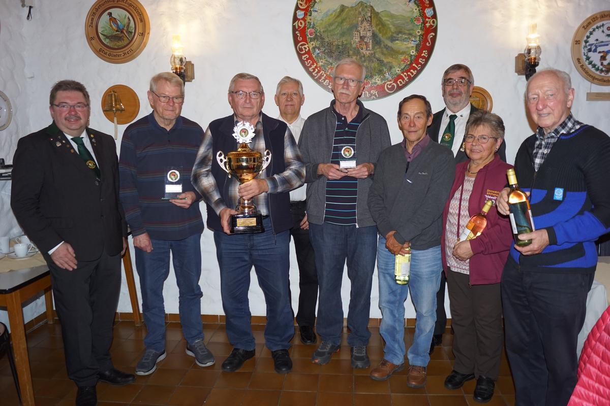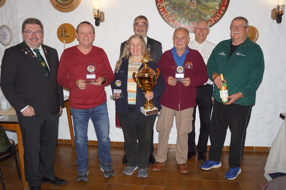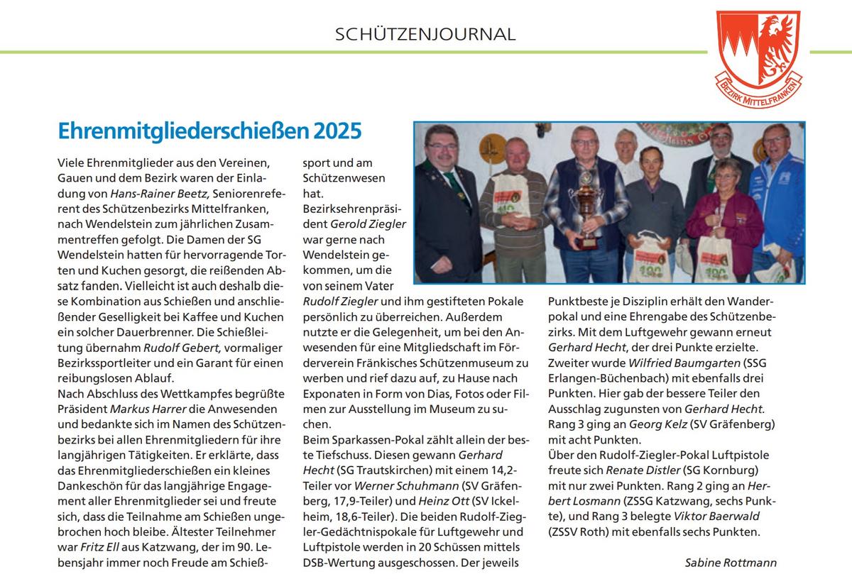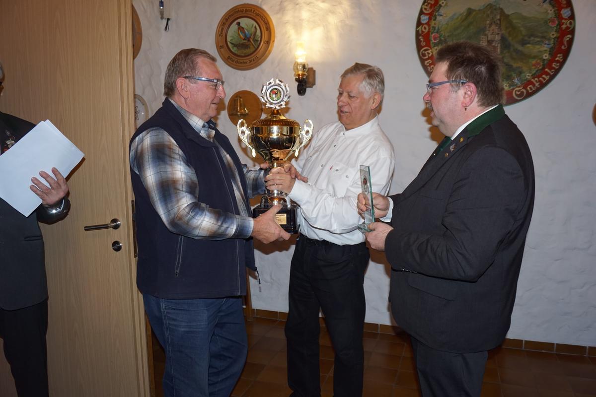 Auch Gerold Ziegler, MSB Ehrenpräsident (rechts im Bild neben Markus Harrer), war gerne nach Wendelstein gekommen, denn wie immer überreichte er die von seinem Vater Rudolf Ziegler und ihm gestifteten Pokale persönlich. Außerdem nutzte er die Gelegenheit, um bei den Anwesenden für eine Mitglied-schaft im Mittelfränkischen Schützenmuseumsverein Wer-bung zu machen. Der Jahresbeitrag beträgt nur 18,-- Euro und jedes Mitglied mehr helfe dem Verein auf einen guten Weg hin zu einer möglichen Förderung und zur Beantragung von Zuschüssen. Außerdem rief er nochmals dazu auf, zu Hause nach Exponaten in Form von Dias, Fotos oder Filmen zu suchen. Hiermit auch unser Aufruf an alle unsere Leser, sich unbedingt bei Gerold Ziegler zu melden, sollten sie derartige Schätze hüten.